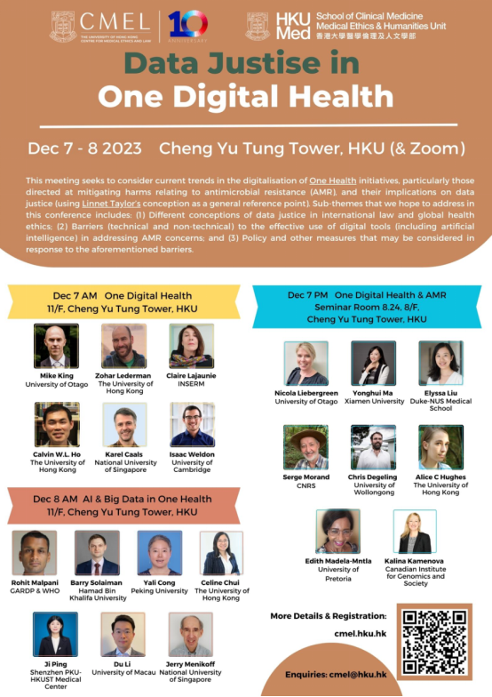 2023年12月4-8日,由香港大学医学伦理及人文学部(医学院)主办的遗传学和人类生殖新兴技术监管治理国际会议(4-6日)和数据正义及同一健康(One Health)国际会议(7-8日)隆重召开,这也是为庆祝香港大学医学伦理与法律中心(Centre for Medical ethics and Law, CMEL)成立十周年而举办的系列学术活动,我院生命伦理中心马永慧副教授受邀参加两个会议并做会议报告,研究生邹琳参与讨论环节。