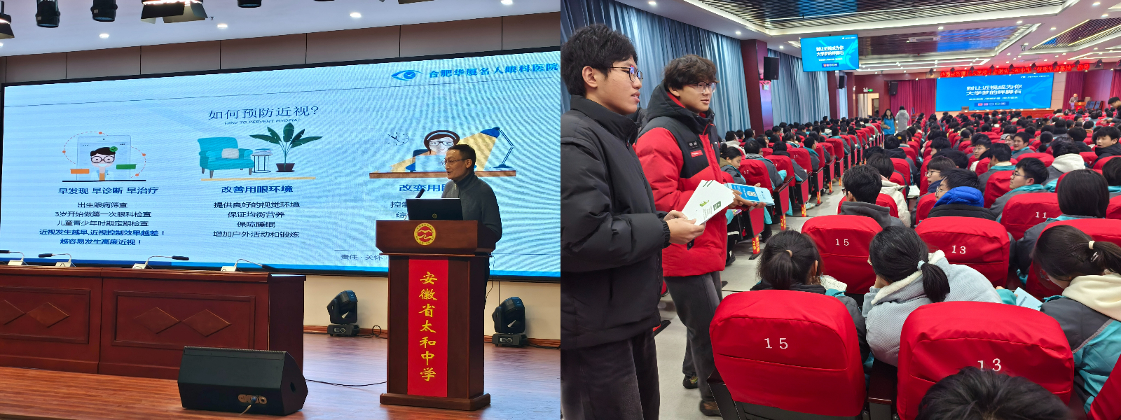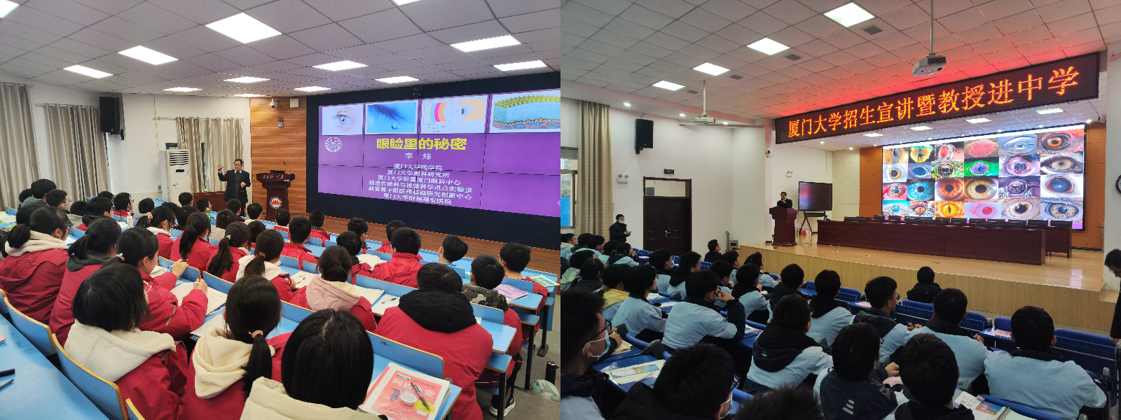 除此之外,医学院本次实践活动还得到了厦门大学附属厦门眼科中心的大力支持,在太和中学招生宣讲现场,合肥华厦名人眼科医院医生做了题为《别让近视成为你大学梦的绊脚石》的科普讲座,以生动有趣的讲解方式,为学生们普及了爱眼知识,引导学生关注眼部健康,预防近视。在各个中学的招生咨询现场,医学院实践队师生们均为与会学生和家长分发了眼科科普健康宣教手册,人工泪液,眼睛热敷贴等爱眼护眼物料,受到了广大学生和家长的热情回应。厦门大学医学院教授们的精彩讲座和厦门大学附属厦门眼科中心的大力支持让参与到招生宣传的中学学生和家长们对厦门大学的综合实力有了更为全面的了解,为中学生们未来的学习之路提供了新的目标与方向。