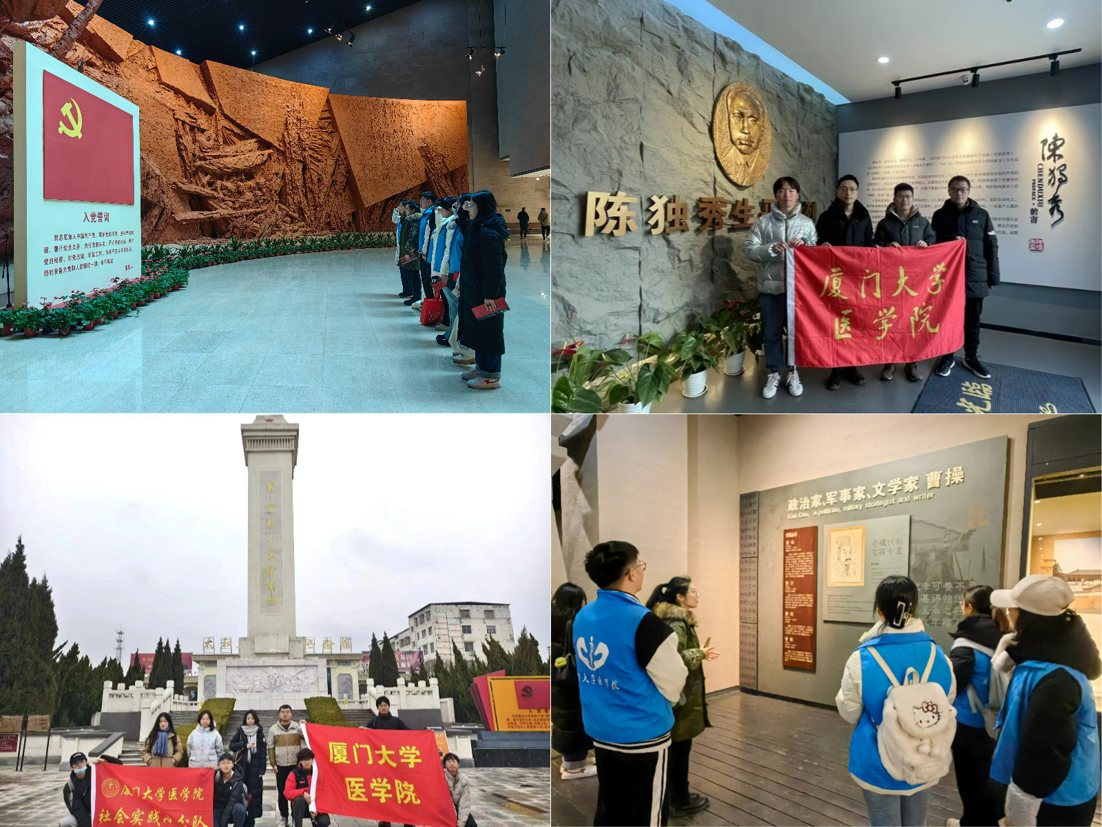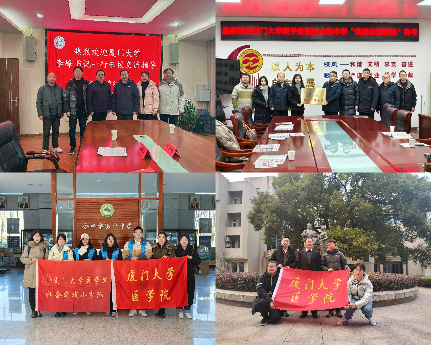为积极落实学校本科招生工作部署,进一步做好2024年度招生宣传工作,吸引更多在皖优秀学子报考厦门大学,医学院结合团委寒假社会实践工作安排,组织开展赴安徽专项寒假社会实践活动。1月14日至18日,学院组织4支实践队伍,由学院党委书记李峰、党委副书记辛晓丹、副院长李炜带队,学院张家兴教授和团委以及教务办等8位老师与18名安徽籍本科生参与,分别赴安徽合肥、六安、阜阳和安庆,走进8所重点生源中学开展招生宣传、优质生源基地挂牌、科普讲座等活动,并带领学生走进安徽红色教育基地,感悟红色精神。