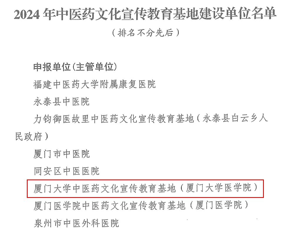 近日,福建省卫生健康委员会、福建省文化和旅游厅公布了2024年福建省中医药文化宣传教育基地建设单位名单,厦门大学中医药文化宣传教育基地(厦门大学医学院)获批。
