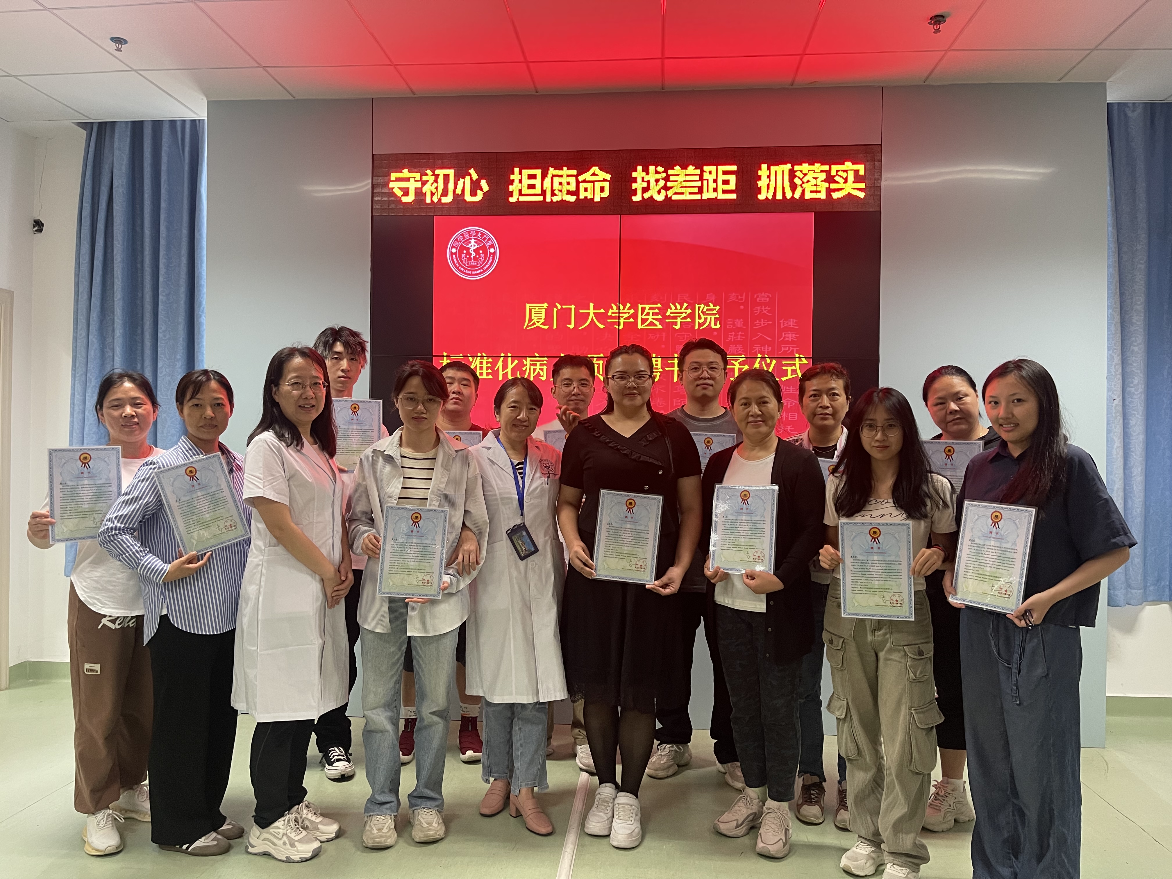 第六期面向社会招募的22名SP志愿者经过基础、记忆、表演、反馈等相关培训和考核后,获得厦门大学医学院颁发的标准化病人聘书。后期他们将与往届资深标准化病人老师们一起在问诊教学、课程考核以及临床医学专业(本科)水平测试和中医师岗位胜任力第二阶梯考核之中作为医学生的“老师”和“考官”,助力我院医学人才的培养。