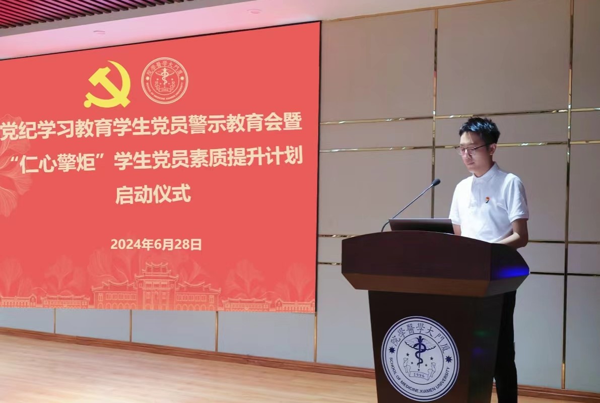 为深入学习领会习近平总书记关于全面加强党的纪律建设的重要论述,贯彻落实学校第十二次党代会精神,开展警示教育,进一步增强纪律意识、提高党性修养,6月28日,医学院党委在翔安校区成义楼102报告厅举办学生党员警示教育大会暨“仁心擎炬”学生党员素质提升计划启动仪式。会议通过“上一堂警示教育课、分享一次学习心得、领取一份成长记录卡、过一次‘政治生日’、重温一次入党誓词”等多种形式,引导学生党员深刻认识开展党纪学习教育的重大意义,真正做到学纪、知纪、明纪、守纪,推进党纪学习教育走深走实。