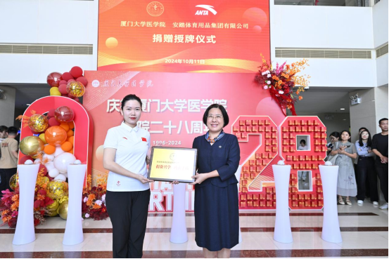 庆祝活动上,学院还举行了捐赠单位授牌仪式。为支持医学院学生更好地完成学业,激励学生刻苦学习、奋发向上,安踏体育用品集团有限公司向学院每年捐资50万元,持续5年,用于设立奖学金。为感谢安踏体育用品集团有限公司的慷慨支持和无私奉献,医学院副院长谢莉萍为其授牌。公司集团事务高级经理康媛姗女士接受授牌,并向学院回赠了礼物——2024年巴黎奥运会冠军领奖服。