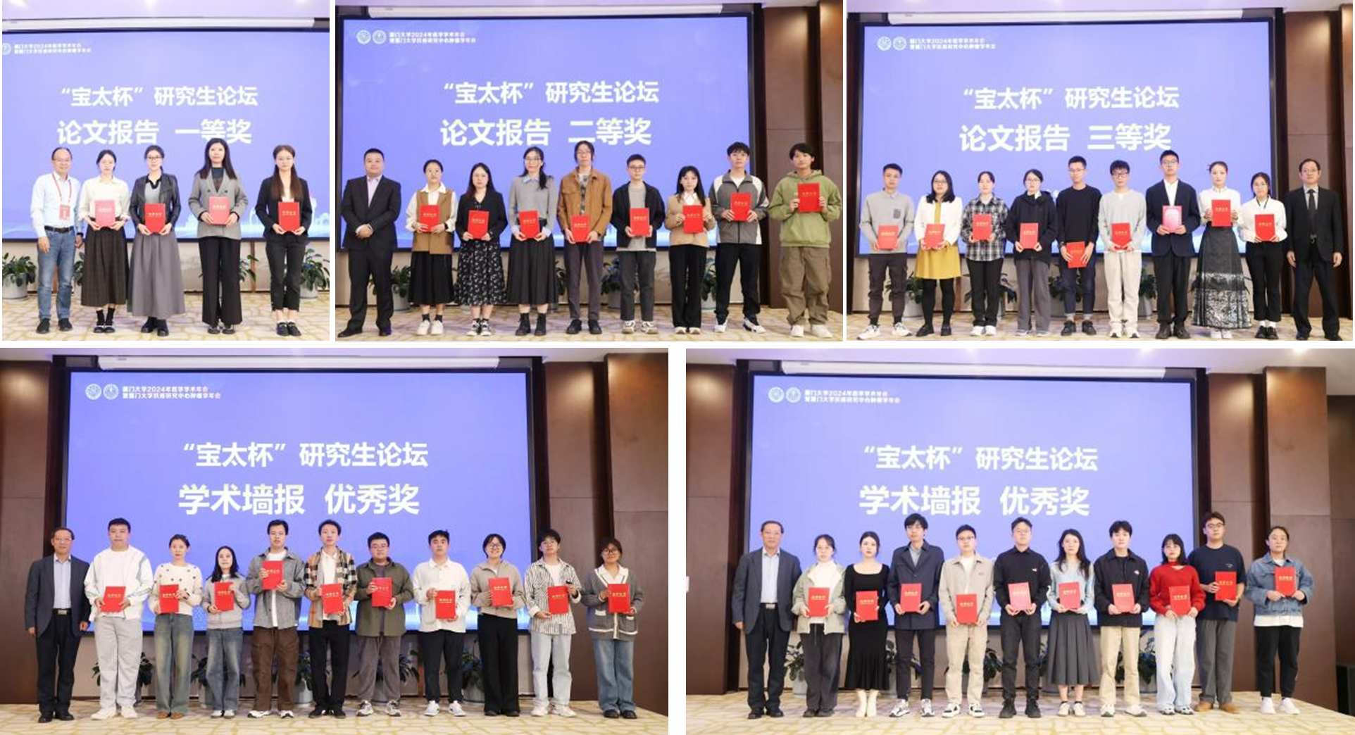 本次研究生论坛评选出论文报告一等奖、论文报告二等奖、论文报告三等奖、学术墙报优秀奖。在颁奖典礼上,厦门宝太生物科技股份有限公司副总经理黄建国、厦门宝太生物科技股份有限公司学术战略总监钟晓骝,医学院副院长李炜、副院长李文岗一起为获奖人颁发荣誉证书,并合影留念。