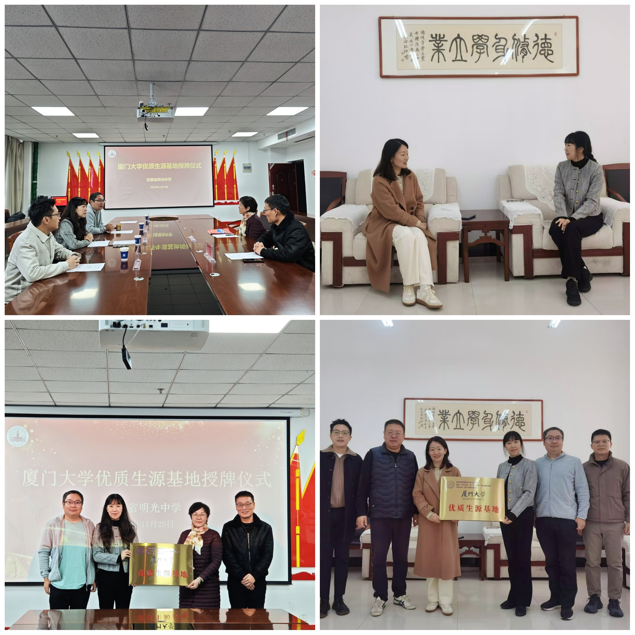为进一步扩大学校办学声誉、拓宽招生渠道、提高生源质量,11月25日至26日,厦门大学安徽招生宣传组分别赴安徽省明光中学、淮南第二中学开展招生宣传活动。医学院党委副书记辛晓丹,医学院特邀咨询员、海洋与地球学院黄永祥副教授等一行分别与两所中学开展座谈交流、教授进中学、招生宣讲等活动。