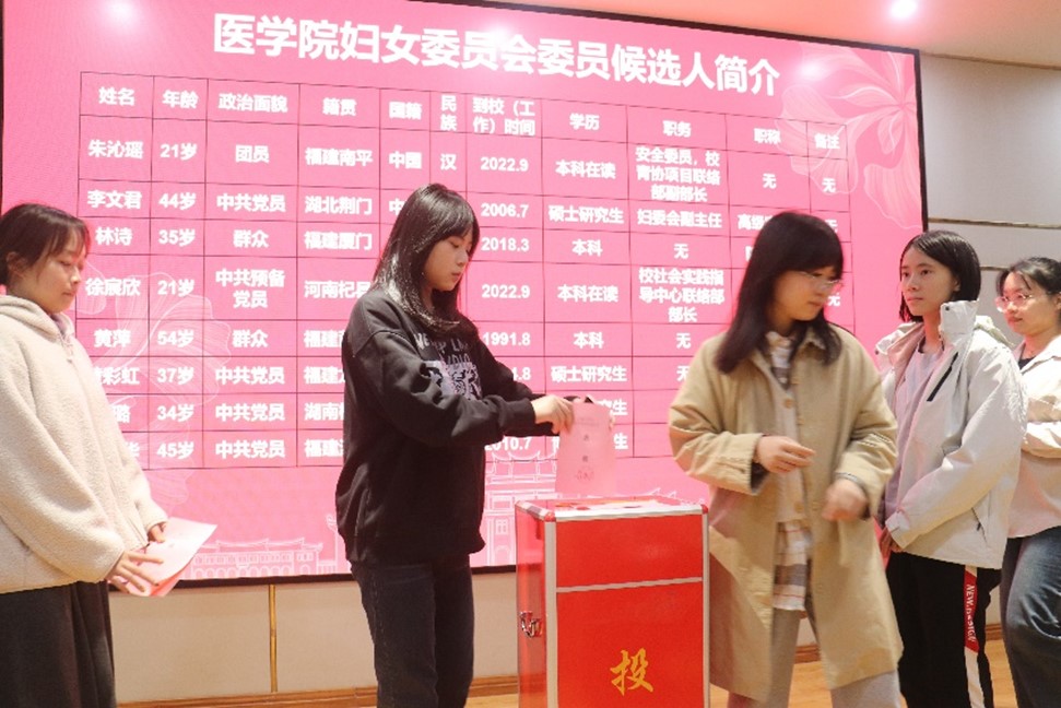 辛晓丹宣读学校妇女委员会关于医学院妇女委员会委员、主任候选人预备人选的批复。随后,全体代表表决通过了《厦门大学医学院妇女委员会换届选举办法》。在严谨有序的选举程序下,通过无记名投票和差额选举方式,李文君、赖鹏华、黄萍、林诗、彭璐、黄彩虹、朱沁瑶等7位师生当选为医学院新一届妇女委员会委员。