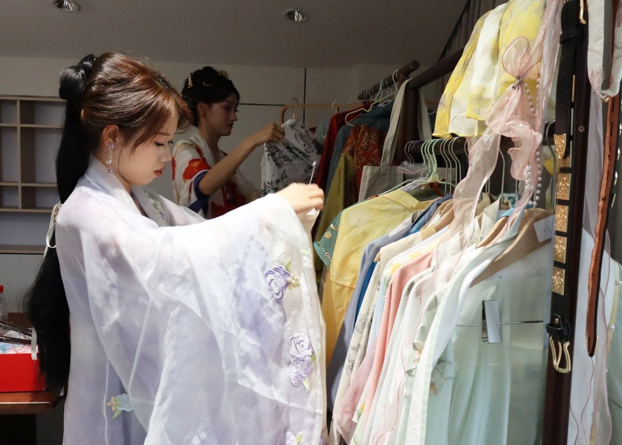 汉服体验活动在新华书店内的汉服文化体验区进行。药园教学助理林静和张晓玥为体验者提供汉服妆造,琼华汉服社的工作人员还为体验者讲解古代服饰知识、妆容发型特点及其文化内涵。