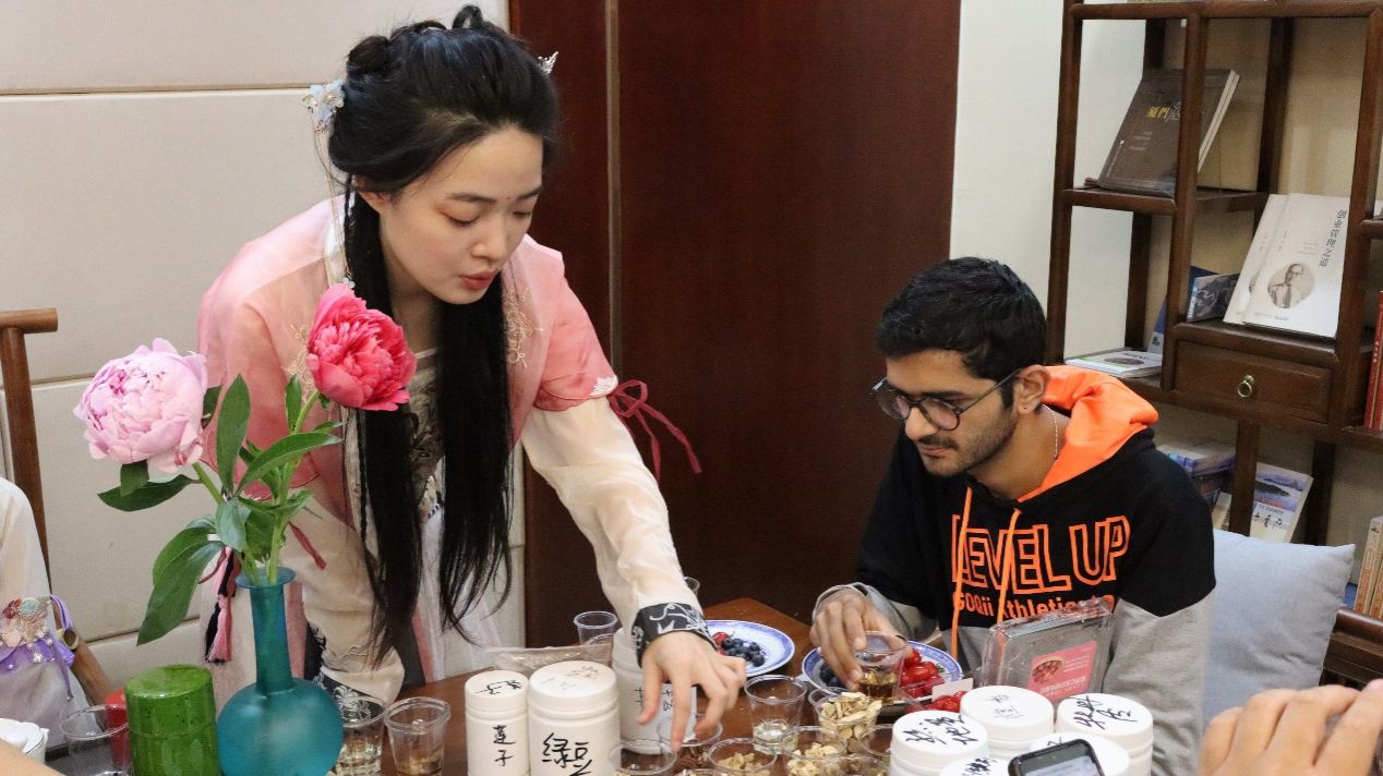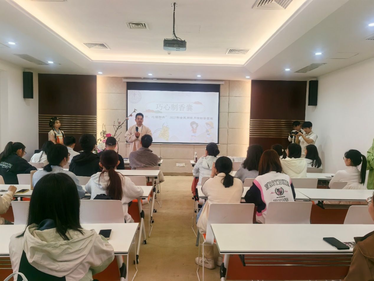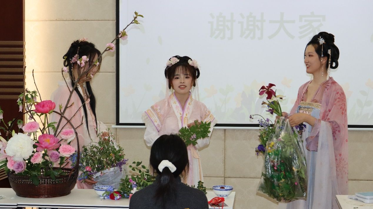 本次活动主题为“花宣香明,心领神卉——多方洞见中医药本草之美”,现场分为香囊配制、识花辨卉、品茗调息、文创盖章及汉服体验等五大环节,以中医药经典为基础,通过赏药卉、制香囊、品佳茗、穿汉服等寓教于乐的形式,带领师生共同领略中医药文化的魅力。
