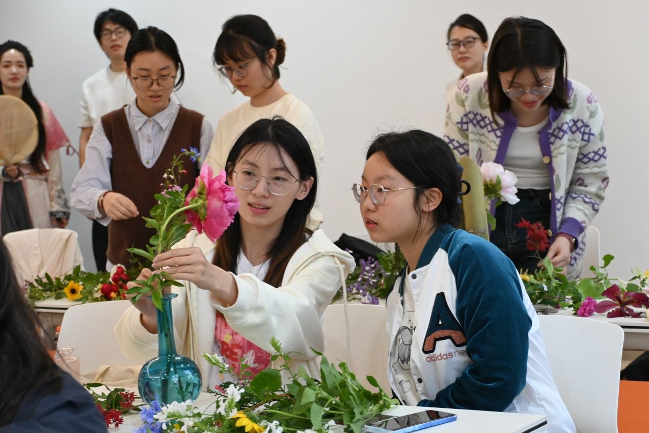 在识花辨卉活动中,药园教学助理李仲雯、葛巧巧和杨慧如向师生们逐一介绍了药园中种植的药用花卉,并与现场师生进行互动问答,一同创作插花摆件。大家通过对花材的选择、搭配和造型设计,将自然之美与人工创意相结合,创作出一件件独特的作品,舒缓情绪,放松身心,丰富了中医药文化的内涵。