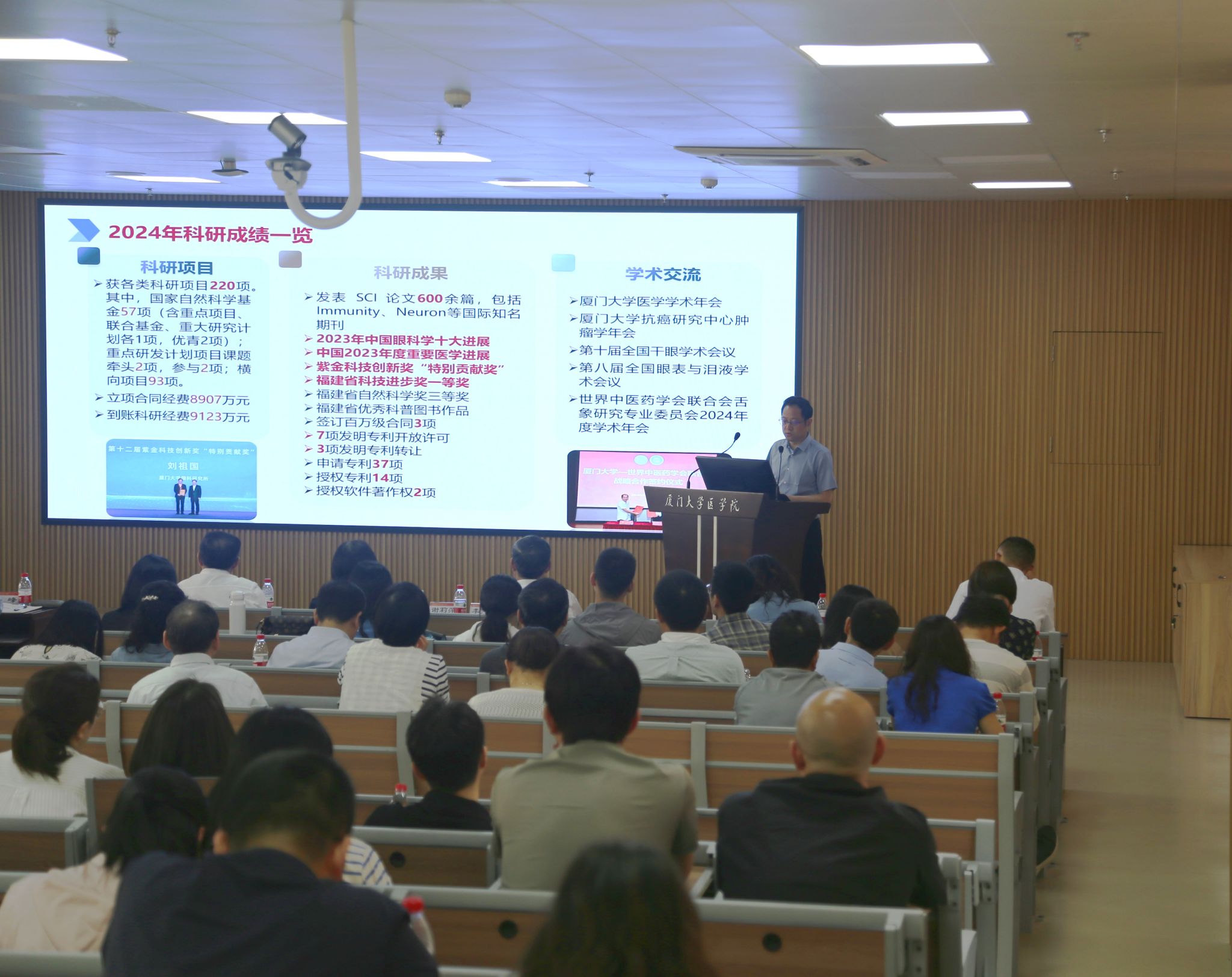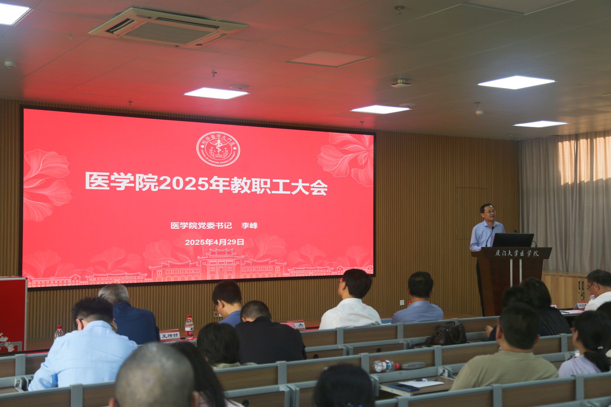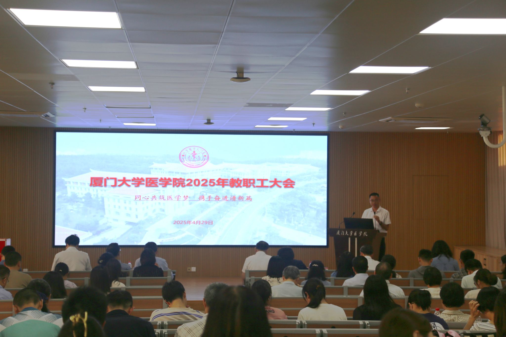 4月29日下午,医学院在翔安校区爱礼楼104报告厅召开2025年全院教职工大会,总结2024年工作,部署2025年重点任务。会议由学院工会主席卓仁恭主持。