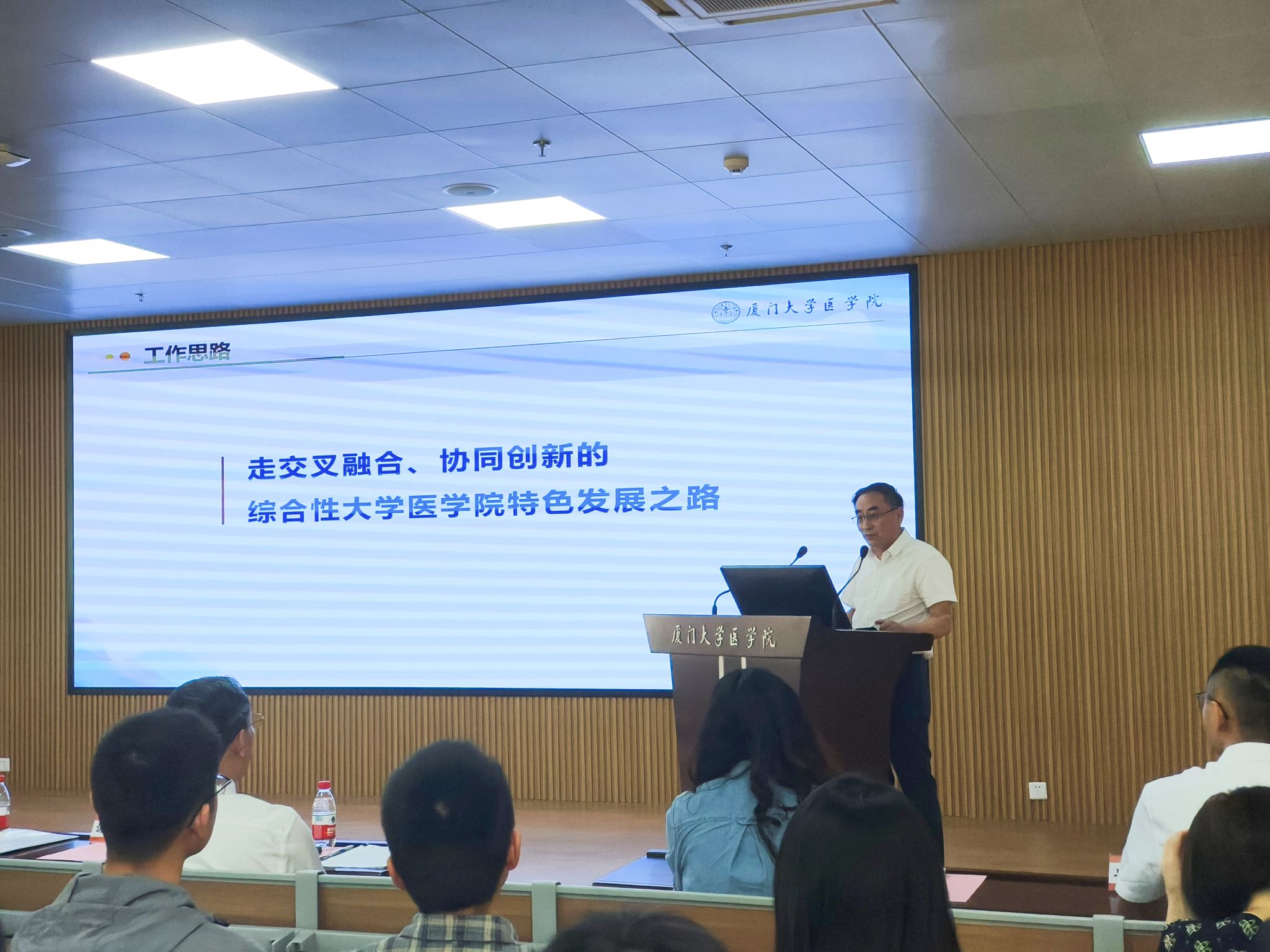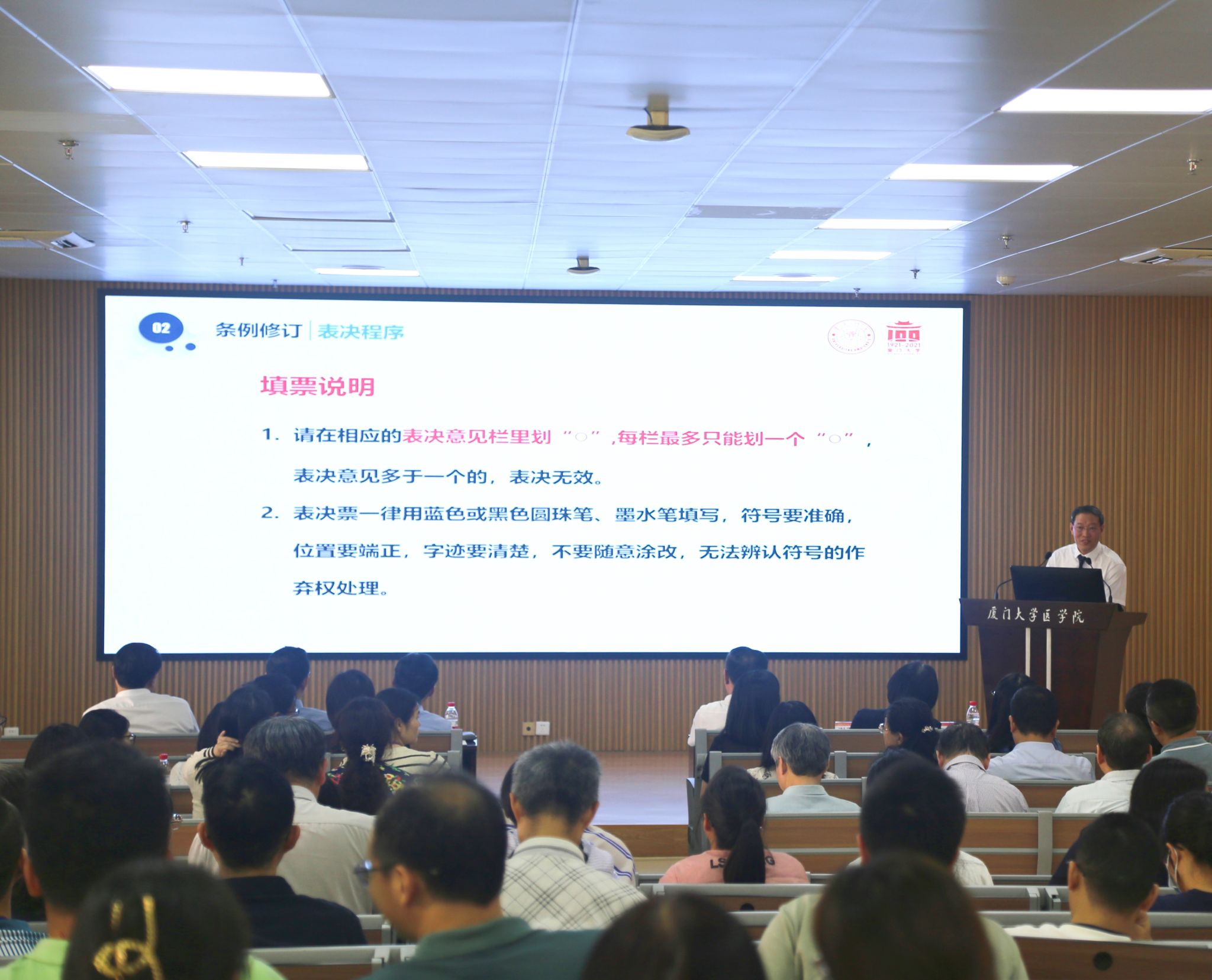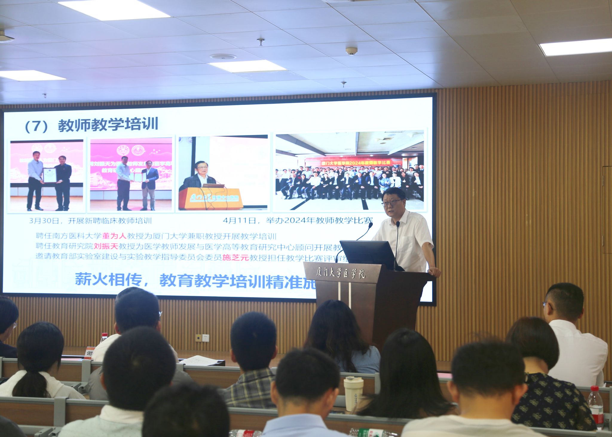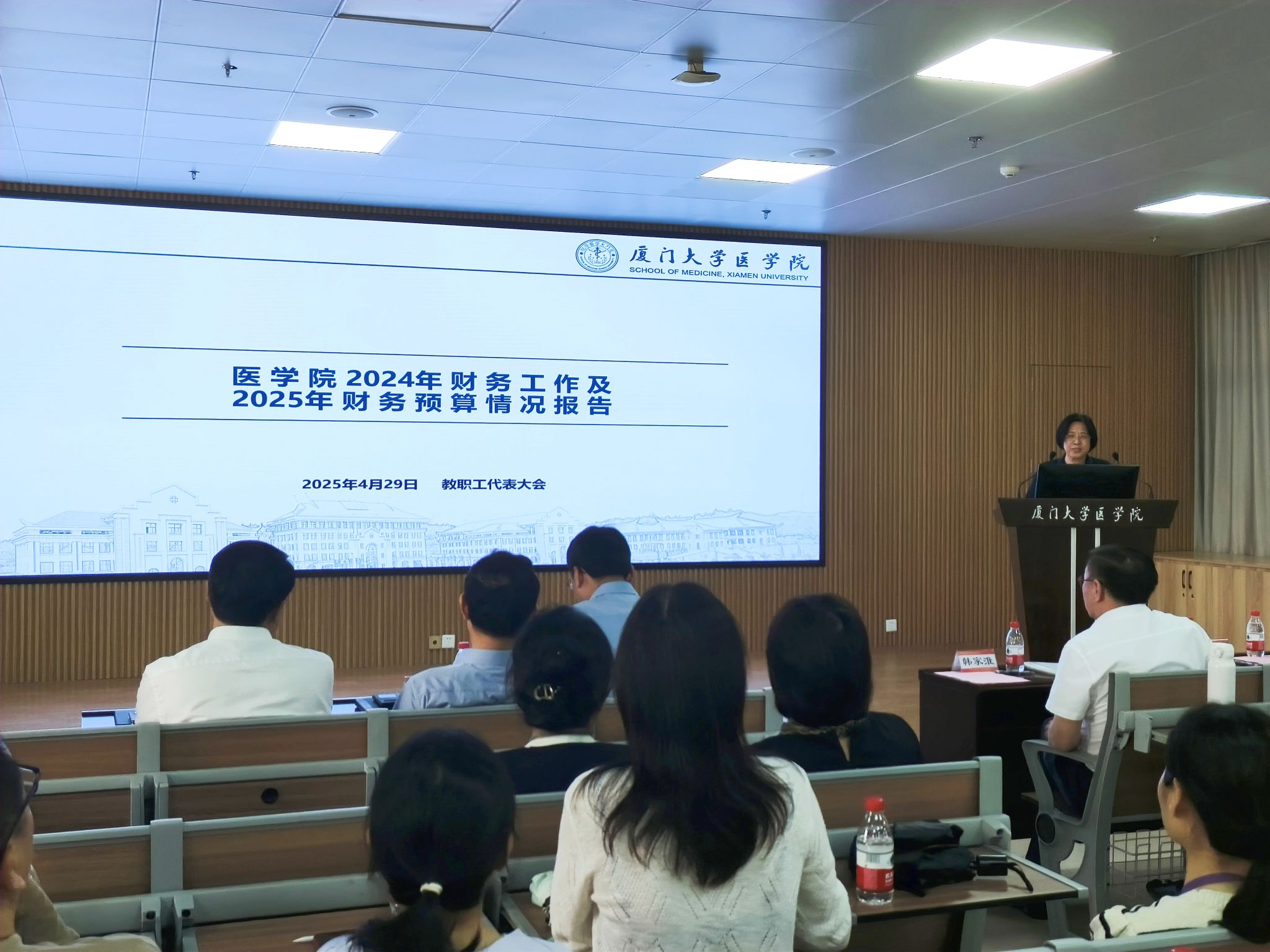 4月29日下午,医学院在翔安校区爱礼楼104报告厅召开2025年全院教职工大会,总结2024年工作,部署2025年重点任务。会议由学院工会主席卓仁恭主持。