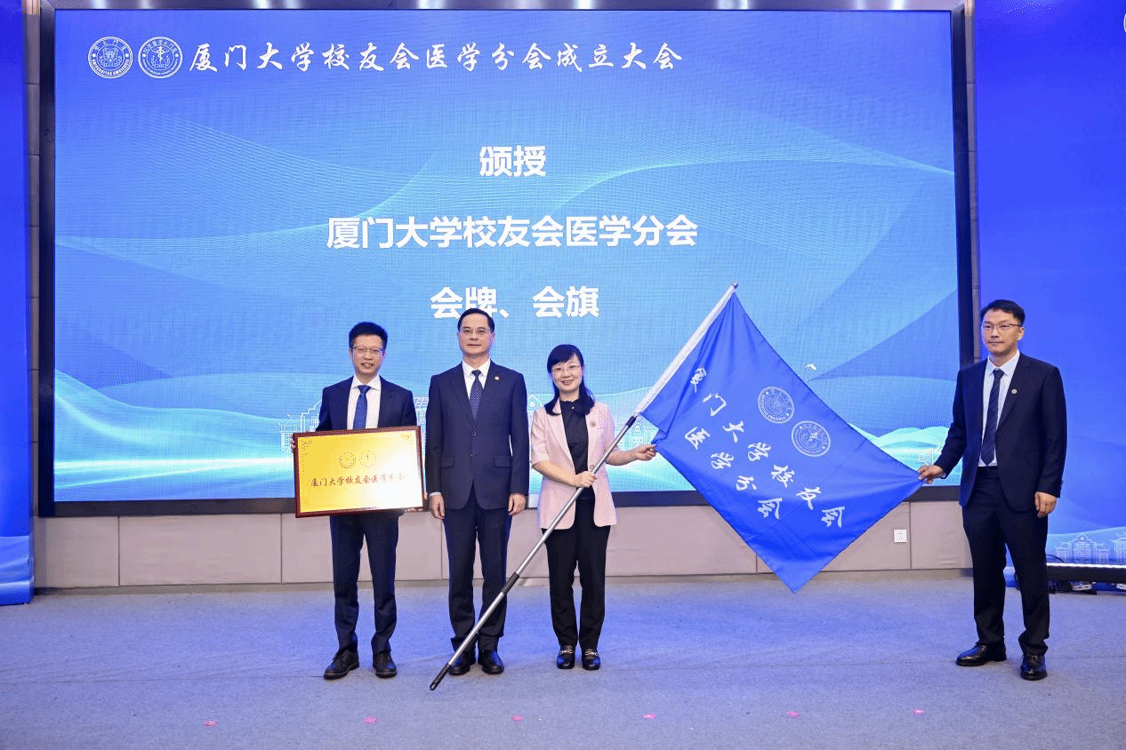 邱伟杰为厦门大学校友会医学分会颁授会旗、会牌。