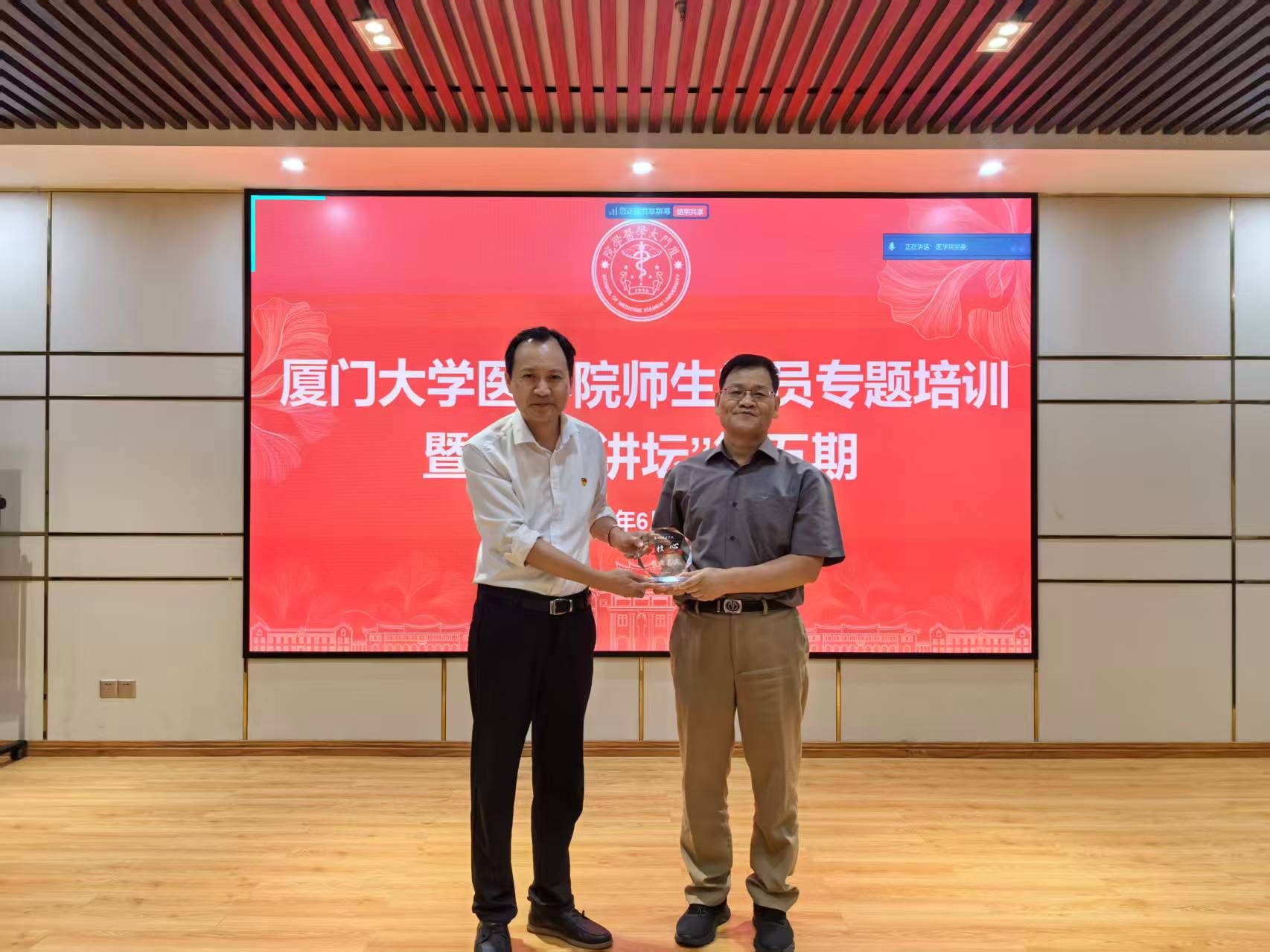 讲座上,李峰为王洪才颁发厦门大学医学院“仁心讲坛”纪念牌。