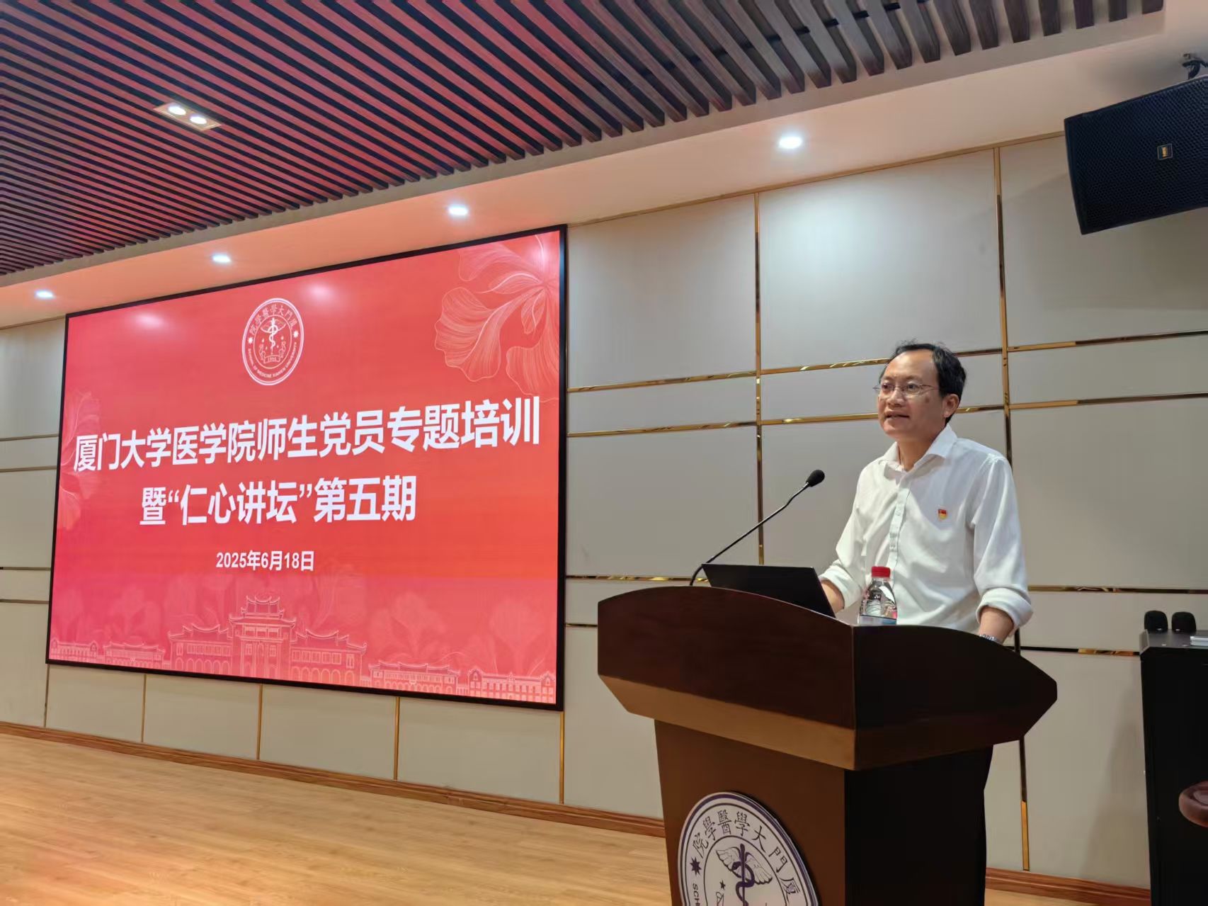 为深入学习领会习近平总书记关于“十五五”规划制订工作的重要指示精神,贯彻落实党的二十大提出的“加快建设教育强国”战略部署,扎实推进《教育强国建设规划纲要(2024-2035年)》落地实施,6 月18日下午 ,医学院党委以举办第五期“仁心讲坛”的方式,开展师生党员专题培训。活动邀请了厦门大学教育研究院王洪才教授作为主讲嘉宾,给师生们带来了一场精彩的辅导报告。医学院党委书记李峰,学院党委委员,师生党支部书记及党员代表,校医科建设与管理办公室副主任、党支部书记杨扬及支部党员参加专题培训。