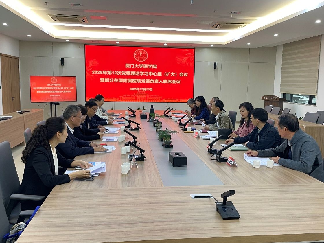 为深入学习贯彻党的二十届四中全会精神,凝聚思想共识,汇聚发展合力,进一步推进医学院与附属医院医教研协同创新发展,2025年12月25日上午,医学院党委在翔安校区爱礼楼北楼106会议室召开理论学习中心组(扩大)会议暨部分在厦附属医院党委负责人联席会议。校医科建设与管理办公室主任、医学院党委书记李峰,医科建设与管理办公室副主任茹晓燕,医学院党委理论学习中心组成员,6家在厦附属医院党委负责人及校医管办、医学院党务办工作人员参加会议。