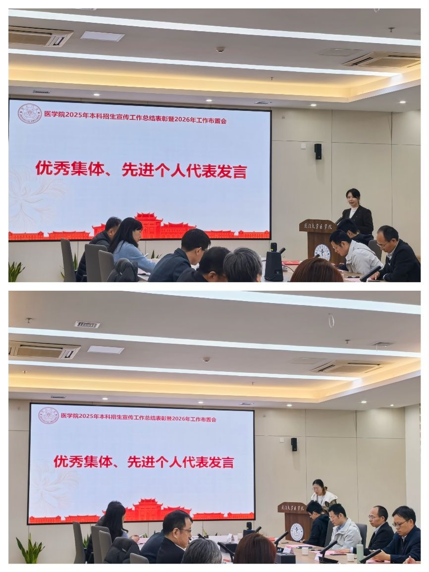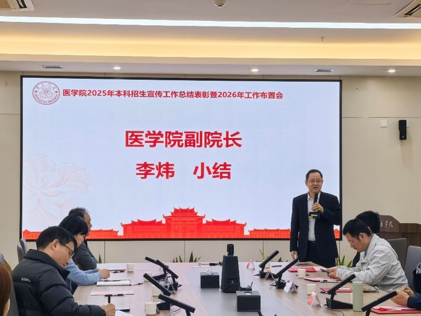 2026年1月5日下午,医学院2025年本科招生宣传工作总结表彰暨2026年工作布置会在翔安校区爱礼楼北楼106会议室顺利举行。会议旨在进一步总结工作经验,表彰先进,凝聚共识。医学院副院长李炜、谢莉萍,党委副书记王坤钟、辛晓丹,院长助理、教务办主任李晴,各系部主任和参与医学院2025年本科招生宣传工作的老师参加会议。同时,学院还特邀新闻传播学院叶虎副教授、航空航天学院董一巍副教授、海洋与地球学院黄永祥副教授、药学院严小胜副教授和马克思主义学院晏振宇副教授参加会议。