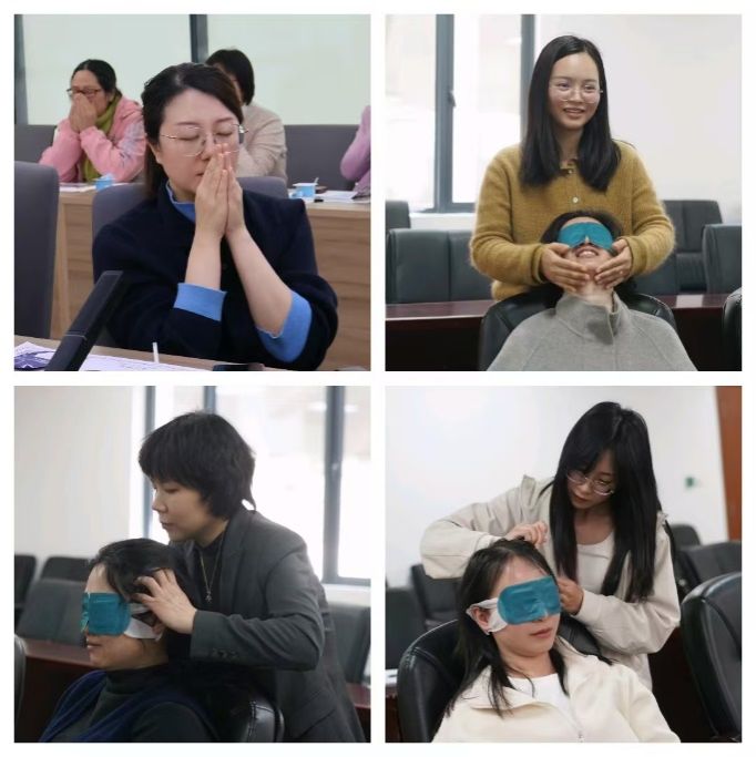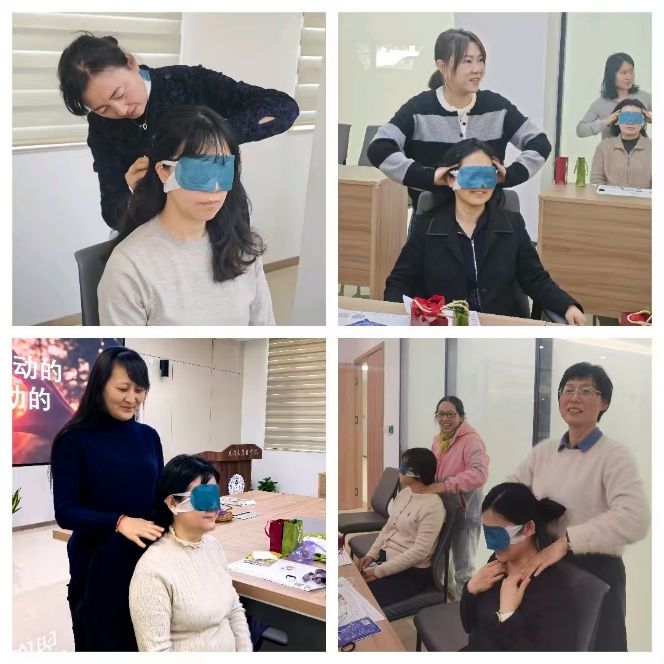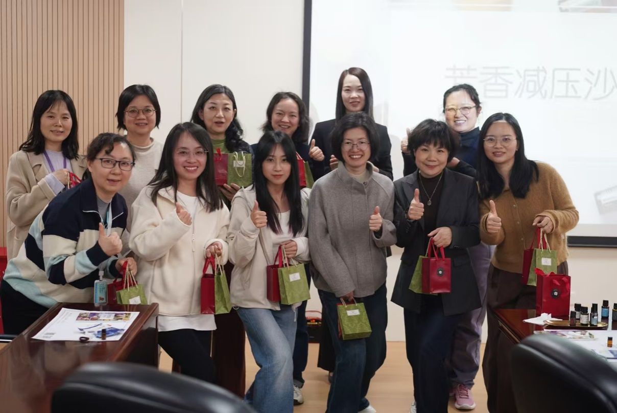 活动伊始,专业芳疗师系统讲解了芳香疗法的医学渊源与现代应用。从《本草纲目》中的芳香植物记载,到现代医学中精油对神经系统与免疫调节的循证研究,老师们在科学与人文的交汇中,重新认识了这场“芬芳之约”。随后的体验环节中,大家通过品味香饮、闻香冥想、精油头疗、肩颈抚触等方式,沉浸式感受植物能量的温润滋养。平日里并肩奋战的同事,此刻轻柔地为彼此揉按肩颈;工作中专注严谨的目光,在香气中化为彼此鼓励的微笑。参与活动的老师们纷纷表示,这场疗愈之旅不仅是身体的放松,更是一次心灵的靠近。